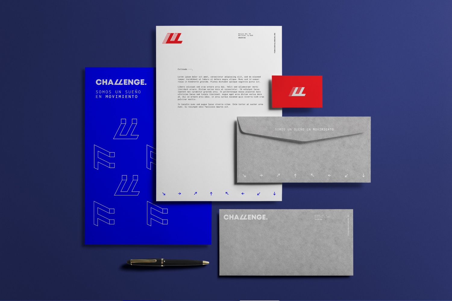 La propia forma de las LL de CHALLENGE ya nos recordaban a un par de sillas y que fueran dos no era casualidad; así que haciéndoles un ligero cambio, que las diferenciara del resto de las letras, ya nos apoyaba el concepto de movimiento que queríamos transmitir. Para el ISO nos quedamos con estas LL transformadas, pero agregándoles un rastro de líneas que parecieran ir dejando a su paso.